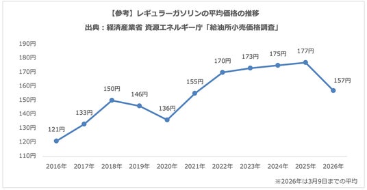 過去10年間の推移をアンケート実施年ごとに見ると、2016年は「130円以上」、2019年は「140円以上」、2022年以降は「150円以上」が最も多く、ガソリン価格の上昇とともに高いと感じる価格も上昇傾向が続いていました。今回も「150円以上」が最多となる一方、昨年より低い価格帯へ回答が分散しており、これまで上昇し続けてきた高いと感じるガソリン価格が少し下がり始めている様子がうかがえます。