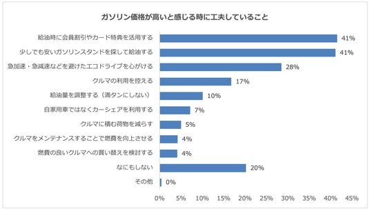 ガソリン価格が高いと感じる時に工夫していることを尋ねると、「給油時に会員割引やカード特典を活用する」「少しでも安いガソリンスタンドを探して給油する」がともに41%で最も多く、多くの人が給油料金の節約に取り組んでいることが分かりました。続いて、「急加速・急減速などを避けたエコドライブを心がける」28%となり、燃費改善による対策を取る人も一定数見られました。