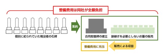 本事業では、血縁者や遺族会に費用負担を求めず、戦没者の石碑の集約・整備費用を同社が全額負担する。整備によって生まれた約56平方メートル の空きスペースには、新たに「羽曳野にしうら墓苑(仮称)」を造成し、跡継ぎを必要としないお墓として販売することで、その収益を整備費用に充てる仕組みとしている。墓苑は個別での供養が可能で、将来的に墓守が難しくなった場合には同墓地内で合祀され、縁ある場所で眠り続けることができる。(本事業の仕組みを図式化すると以下の通り。)