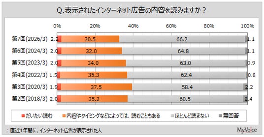 マイボイスコム株式会社(東京都千代田区、代表取締役社長:清水慎太郎)は、7回目となる『インターネット広告』に関するインターネット調査を2026年3月1日~7日に実施しました。