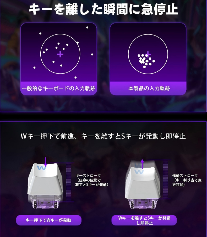 ・ DKS(ダイナミックキーストローク):キーを押し込む時と離す時で、複数のアクションを段階的に実行できます 。