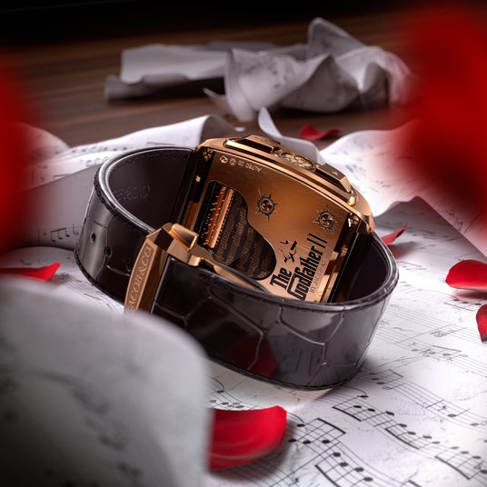 ブラックラッカー仕上げのダイヤルは、映画の持つノワール的世界観を想起させるとともに、ドン・コルレオーネをはじめとする作品の象徴的要素を繊細な彫刻や装飾として表現。時計全体を通して、まるでひとつの物語を鑑賞するかのような造形が構築されています。