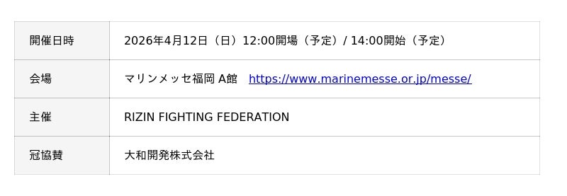 RIZINは、日本最高峰の総合格闘技イベントとして2015年に旗揚げされ、年間を通じて国内外のトップファイターが参戦する格闘技団体です。有明アリーナ、さいたまスーパーアリーナ、マリンメッセ福岡といった各地の大型アリーナで開催される大会は、ABEMAやU-NEXT等のプラットフォームによるPPV配信を通じて、日本のみならず世界中のファンを熱狂させています。■4月12日開催「大和開発 presents RIZIN LANDMARK 13 in FUKUOKA」