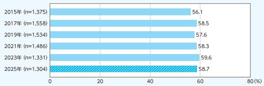 学校の運動部やサークル、民間のスポーツクラブ(スイミングクラブや体操クラブなど)、地域のスポーツクラブ(スポーツ少年団や地域のスポーツ教室など)への加入状況をみると、2025年は58.7%であり、2015年以降50%台後半で推移している。