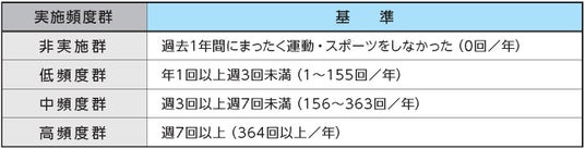 性別にみると、男子では「高頻度群」40.7%、「中頻度群」35.2%、「低頻度群」20.4%、「非実施群」3.7%であり、女子では「高頻度群」32.7%、「中頻度群」34.5%、「低頻度群」28.5%、「非実施群」4.4%であった。「高頻度群」「中頻度群」の割合は男子が女子を上回り、「低頻度群」「非実施群」の割合は女子が男子よりも高い。