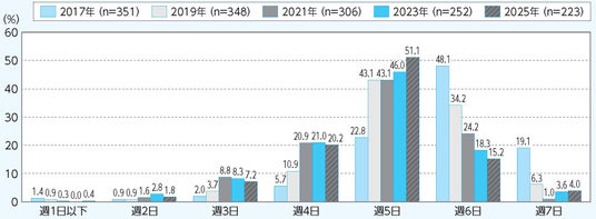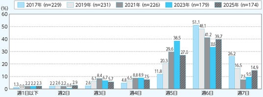 階的に増加してきたが、2023年から2025年にかけて11.5ポイント低下した。「週6日」は2017年以降減少を続けてきたものの、2025年は2023年の33.5%から6.2ポイント上昇した。また、「週7日」も2017年から一度は減少傾向を示したが、2021年以降は増加している。高校生の活動日数は2023年から2025年にかけて「週6日」「週7日」の割合が増加したため、全体として増えたといえる。