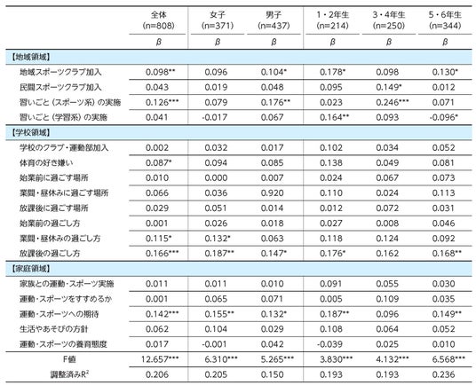 運動・スポーツ実施頻度群と地域、学校、家庭の各領域における変数の分析結果をみると、地域領域(地域スポーツクラブに加入している、スポーツ系の習いごとをしている)、学校領域(体育を好きである、業間・昼休みや放課後にからだを動かす)、家庭領域(保護者が子どもの運動・スポーツに多くを期待する)はいずれも子どもの運動・スポーツ実施頻度の多寡に影響を及ぼしていた。