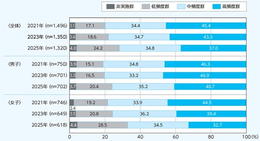 - 「非実施群」4.0%、「低頻度群」24.2%と、2021年調査からそれぞれ0.9ポイント、7.1ポイント増加。