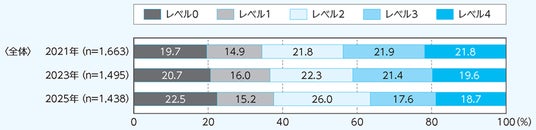 - 「レベル0」22.5%と、2021年調査から2.8ポイント増加。