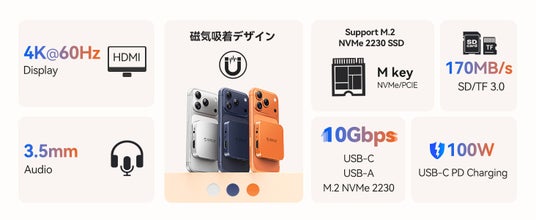 背面のカバーを開ければ、M.2 2230 NVMe SSD を装着可能。 10Gbpsの高速転送に対応しているため、iPhoneで撮影した ProRes動画 を直接外部SSDに保存できます。スマホ本体の容量を気にせず、4Kクオリティで撮り放題です。
