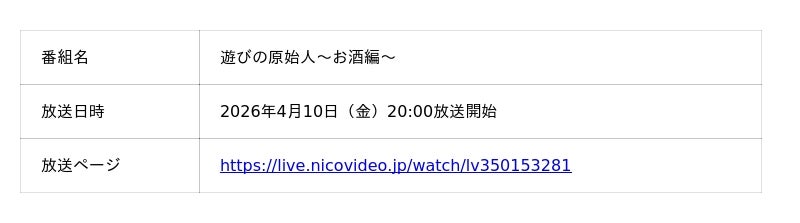 株式会社ドワンゴ(本社:東京都中央区)はライブ配信サービス ニコニコ生放送にて、特番バラエティ「遊びの原始人~お酒編~」の放送を決定いたしました。