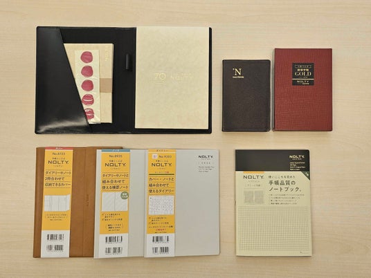 大賞作家への贈呈品。左上から、NOLTY リーガルパッドホルダー&レターセット、NOLTY 能率手帳 ゴールドデイリーブック左下からNOLTY ティオ フラップ付きカバー&ブックセット、NOLTY ティオ A5マンスリー・補充ノートA5、NOLTYノート A5クリーム用紙