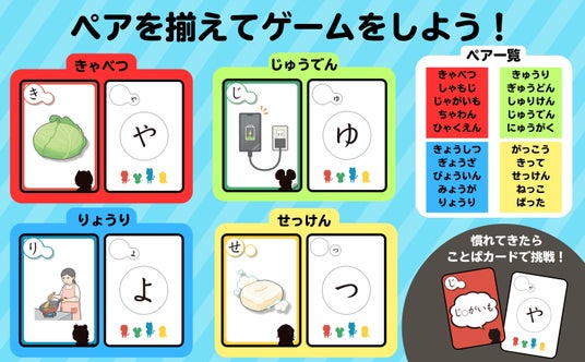 色分けされたヒントを手がかりに、「ばばぬき」や「神経衰弱」などのゲームにくり返し取り組むことで、拗音・促音のしくみが自然と身につくよう設計されています。