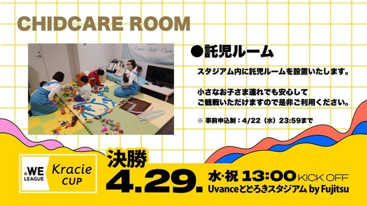 WEリーグでは、4月29日(水・祝)に開催される「2025/26 WEリーグ クラシエカップ決勝」において、託児ルームを設置いたします。