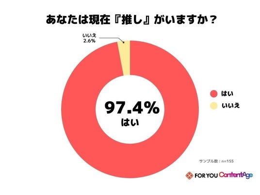 「あなたは現在『推し』がいますか?」という質問に対し、回答者の97.4%が「いる」と回答した。若年層において推しを持つことは決して特別なことではなく、多くの人にとって身近な存在となっていることがうかがえる。