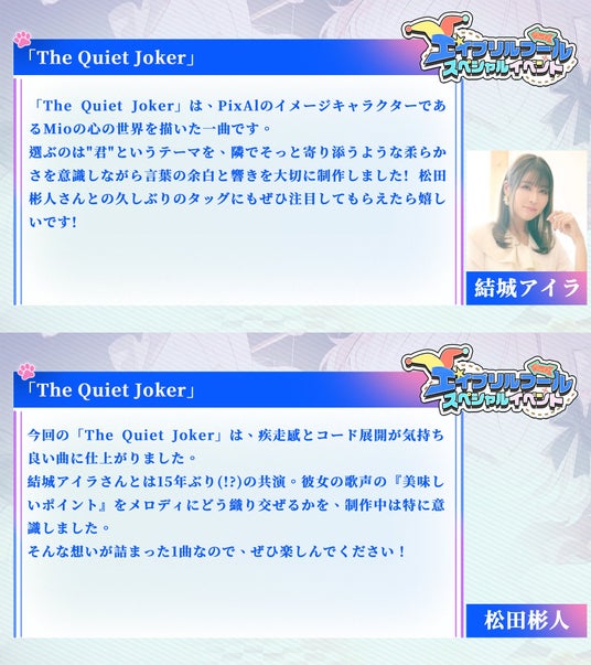 AI二次元創作プラットフォーム「PixAI」を運営するMetanomaly株式会社(本社:東京都渋谷区、代表取締役:レイブン・ガオ)が公開中のオリジナルMV「The Quiet Joker」 について、楽曲を手がけた結城アイラ氏、松田彬人氏よりコメントが到着しました。