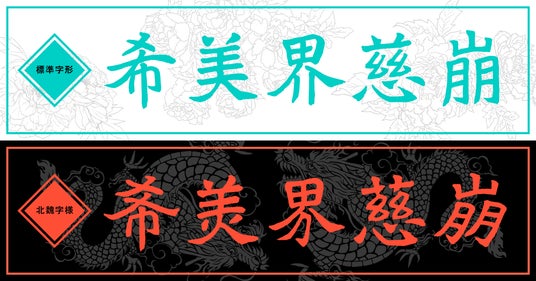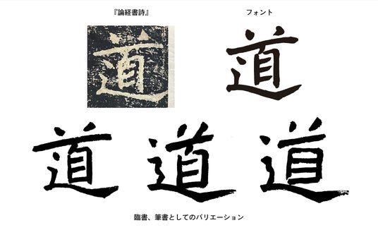 現代の標準的な字形での利用はもちろんのこと、『鄭羲下碑(ていぎかひ)』をはじめとした北魏時代の古典的なスタイルも「北魏字様」として同梱しています。この北魏字様には800文字を超えるユニークな字形が収録されており、世界観を広げつつも文の意味は崩さない程度の形が多いので、使用の幅が一層広がりそうです。