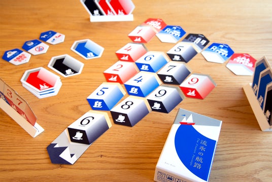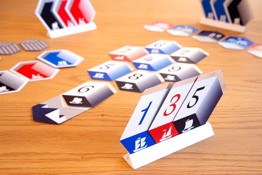 1から9までの数字が書かれた3色のカードを、スタート地点から逆ピラミッド状に順番に並べてゆき、ゴールまで並べきると全員の勝利となる協力ゲームです。ただし、カードの並べ方には決まりがあり、何も考えずに出していくと置けなくなってしまうことも。お互いの手札の数字は隠されているため、手札を予想して助け合いながら、カードを並べきることを目指しましょう!