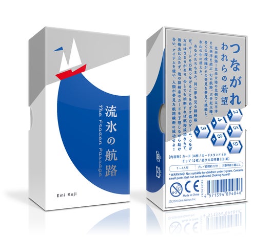 『流氷の航路』は、プレイヤー全員で探検隊となり、それぞれが思考と工夫をめぐらせ、アイテムを駆使しながら航路の横断を目指す、協力ゲーム。並び立つゴールカードに向けて、航路を徐々に広げのばしていく、ロマン溢れる盤上の冒険です。この手番で自分はどのようにふるまうべきか?アイテムをどのように活用すべきか?情報がうまく共有できない中、成功に向けて意識をひとつにしていく。心躍る体験を、どうぞ。