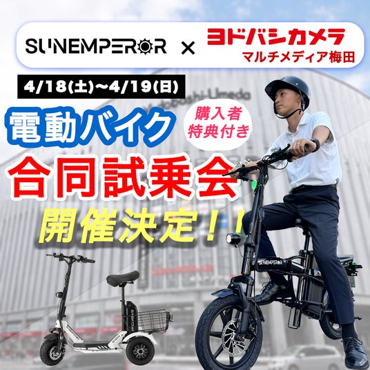 電動モビリティブランド「Sun Emperor(サンエンペラー)」を展開する有限会社 龍昇(本社:愛知県名古屋市)は、2026年4月18日(土)・19日(日)の2日間、ヨドバシカメラ マルチメディア梅田店にて、合同試乗会を開催いたします。