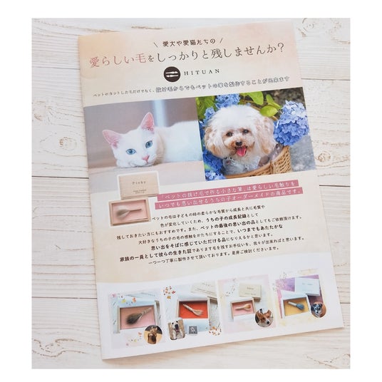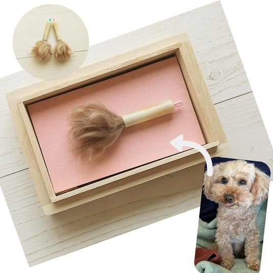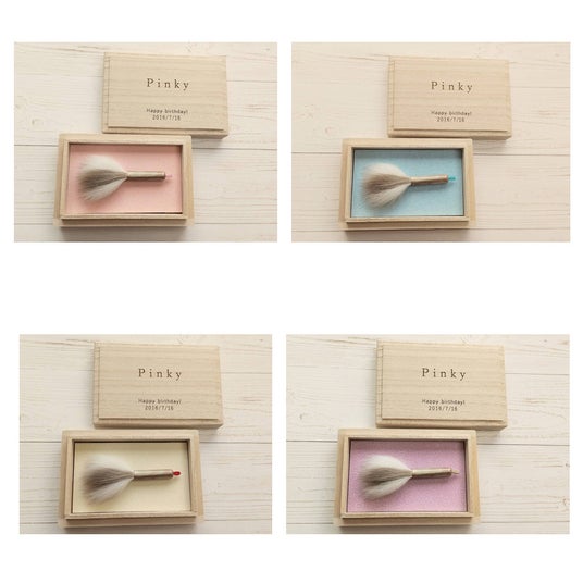 当社では「ペットの抜け毛で作る小さな筆」という商品名でペット筆の販売を行っております。25年ほど前、友人の家で飼っていた犬の毛で筆を作りプレゼントしたことがきっかけです。「またあの子の毛のぬくもりを感じれるなんて、うちの家宝だわ。」と、友人のお母さんがとても喜んでくれいたのがとても印象的でした。もしかしたら同じようにペットを飼っている方にも喜んで頂けるのではないかと思い、販売を思い切って始めました。我々が培ってきた筆製作の選毛の技術を使えば、ペットのカットした毛だけでなく、普段ブラッシングした時に出る抜け毛からでもペットの筆を製作することが出来るからです。