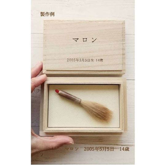 ◯亡くなった愛犬の毛でお願いしました。とても丁寧な梱包に私どもの想いを大切にして頂いたのが伝わりました。小さな桐箱の中の筆は生前の愛犬が帰ってきたかのような愛おしさがあり感激しました。宝物にしたいと思います。ありがとうございました。