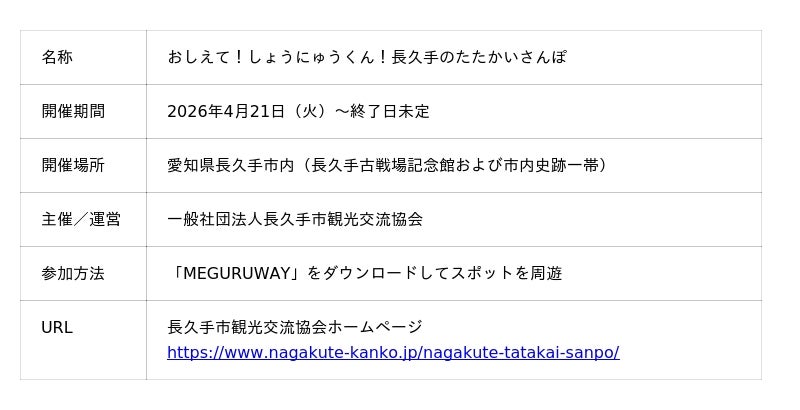 カシオ計算機は、一般社団法人長久手市観光交流協会と協業し、当社のアプリ「MEGURUWAY(メグルウェイ)」を活用したデジタル旅ガイドスタンプラリー「おしえて!しょうにゅうくん!長久手のたたかいさんぽ」を、4月21日より公開いたします。