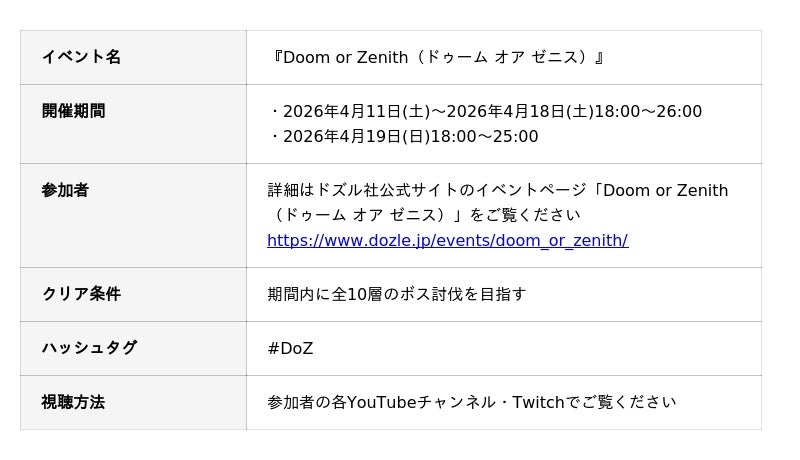 株式会社ドズル(本社:東京都品川区、代表取締役社長:ドズル、以下、ドズル社)は、約150名が集結する、ゲーム『マインクラフト』を活用した大型生配信イベント『Doom or Zenith(ドゥーム オア ゼニス)』(以下、本イベント)を、2026年4月11日(土)~4月19日(日)に開催します。本イベントは、ドズル社が史上最高額(※1)の製作費と1年以上の歳月をかけて制作した完全オリジナルのMMORPGを舞台にしています。