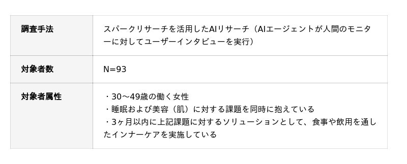 株式会社pow(本社:東京都渋谷区、代表取締役:柳澤 蓮)は、生成AIを活用した市場/ユーザーリサーチエージェント「Spark Research(スパークリサーチ)」(URL:https://sparkresearch.jp/)にて93名の対象者に実施した調査のサンプルレポートを公開したことをお知らせいたします。今回公開した「睡眠×美容ナイトドリンクの受容性調査」についてのレポートは、サービスページよりどなたでもご覧いただけます。