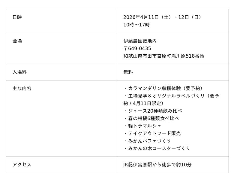 和歌山県有田市の柑橘専門農園「伊藤農園」は、2026年4月11日(土)・12日(日)の2日間、