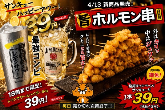 今回の発売を記念し、「ホルモン串」をより多くのお客様に気軽にお試しいただけるよう、2026年4月30日(木)までの期間限定で1本39(サンキュー)円にてご提供いたします。