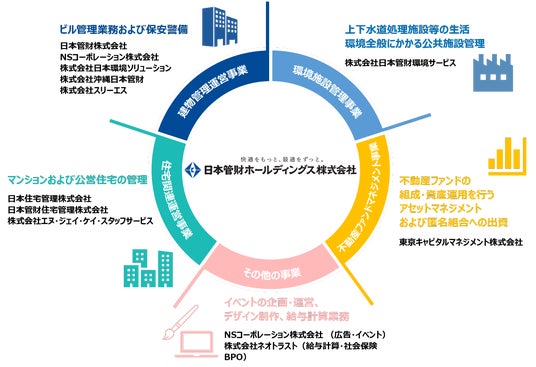 日本管財グループは1965年に設立し、現在は国内及び海外で建物管理運営事業、環境施設管理事業、住宅関連運営事業、不動産ファンドマネジメント事業等を展開しています。独立系であることを強みに、オフィスビル、商業施設、ホテル、教育機関、公共施設など、幅広い用途に携わっています。日本管財ホールディングス株式会社は持株会社として2023年に設立し、グループ経営機能に特化しています。