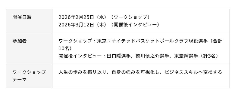 アスリートは、一人の人間としてどのような価値観を持ち、どのような未来を描いているのか。2026年2月、東京ユナイテッドバスケットボールクラブ(TUBC)のパートナー企業である日本管財株式会社は、選手を対象に「自分史ワークショップ」を開催しました。目的は、これまでの歩みを振り返り、自分の強みや価値観を「言語化」すること。それは、競技パフォーマンスの向上だけでなく、社会貢献やセカンドキャリアといった「競技の先」にある人生を豊かにするための第一歩でもあります。