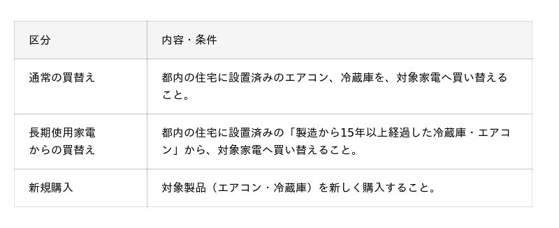 省エネルギー性能の高い新品のエアコン・冷蔵庫・給湯器・照明器具の買い替え、またはエアコン、冷蔵庫の新規購入が対象となります。