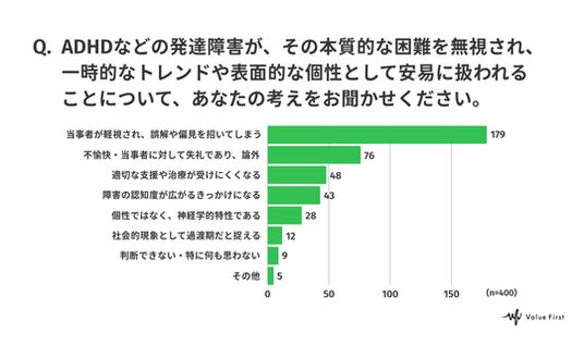 「ADHD(注意欠陥・多動性障害)などの発達障害が、その本質的な困難を無視され、一時的なトレンドや表面的な個性として安易に扱われることについて、あなたの考えをお聞かせください。」という質問に対し、最も多かった回答は「当事者が軽視され、誤解や偏見を招いてしまう(179件)」でした。