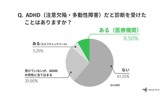 「ADHD(注意欠陥・多動性障害)だと診断を受けたことはありますか?」と尋ねたところ、「ある(医療機関)」は8.50%、「ある(Webサイトなどのセルフチェックツール)」は5.25%、「受けていないが、ADHDの特性に当てはまる」と回答した方は25.00%でした。