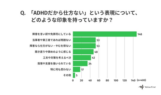 「『ADHDだから仕方ない』という表現について、どのような印象を持っていますか?」という質問に対し、回答者の約3割が「障害を言い訳や免罪符にしている」と回答しました。