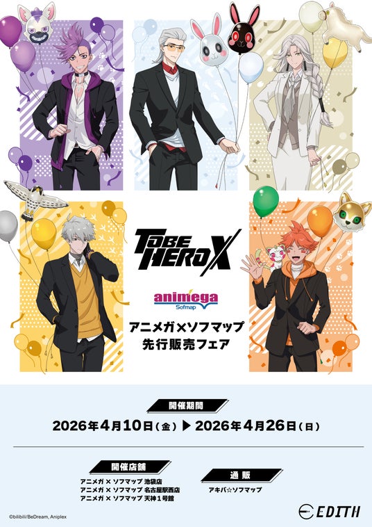 イベント事業・グッズ事業を手掛ける株式会社イーディス(本社:東京都豊島区、代表取締役:森俊平、以下イーディス)は、アニメ「TO BE HERO X」の描き下ろしイラストを使用したグッズをアニメガ×ソフマップにて先行販売いたします。