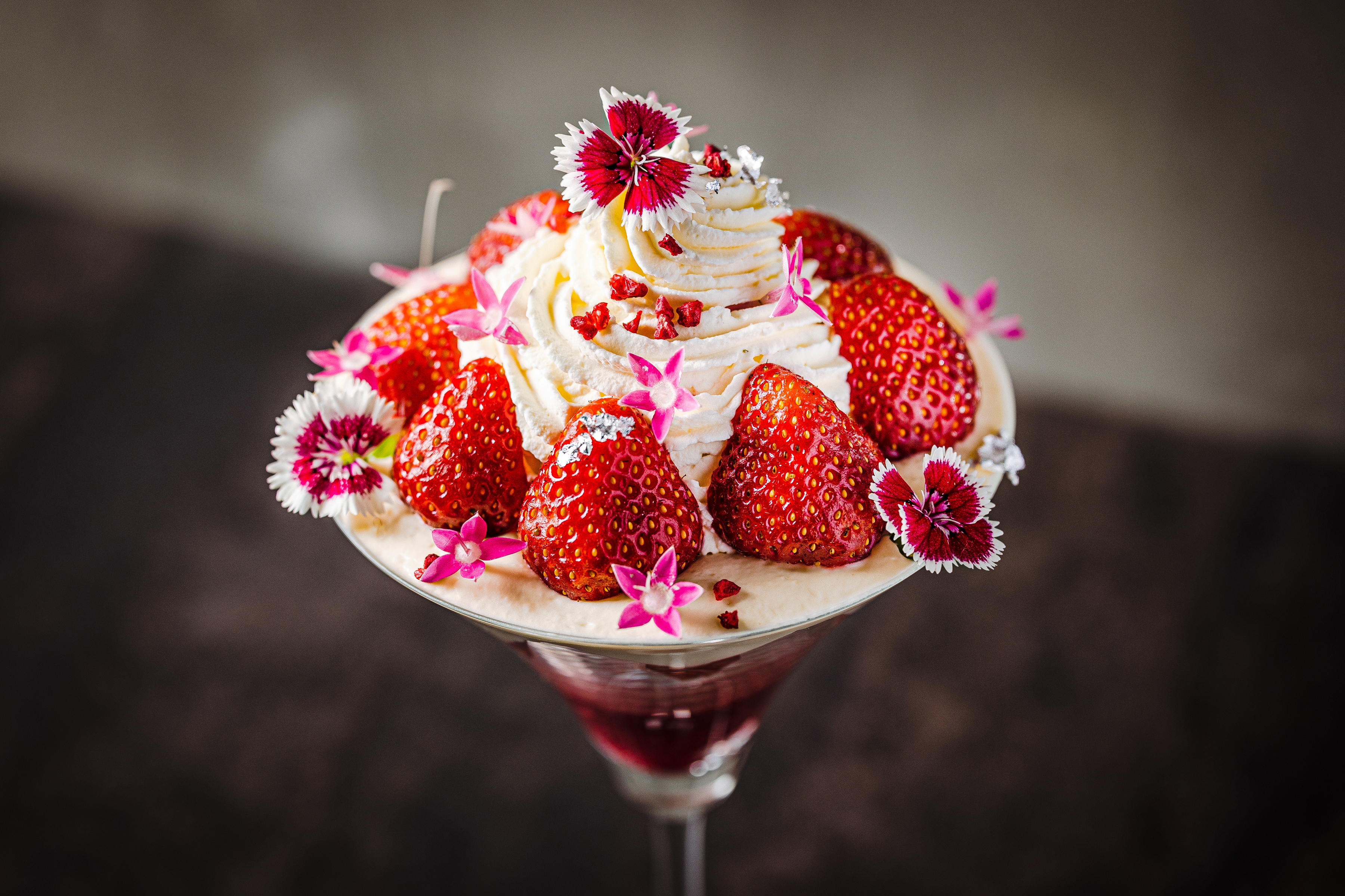 ふわりとなめらかなストロベリークリームの上に、みずみずしいイチゴのスライスを重ねて。繊細にきらめくジュエリーシュガーが、あじさいに宿る雫のような輝きを添えます。ひとくちごとに、静かに広がる華やかさを楽しめる一品です。