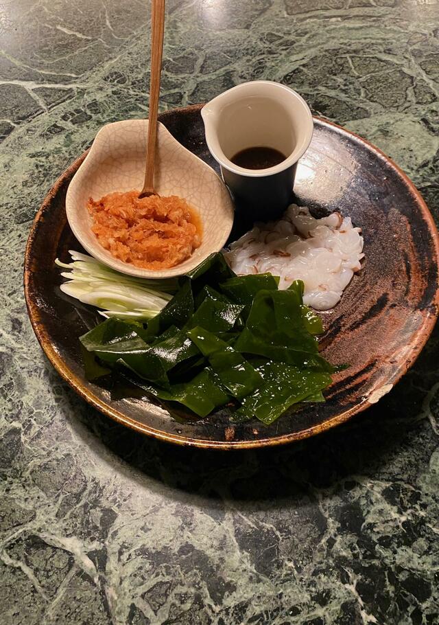 水だこをしゃぶしゃぶにしてみました。わかめとネギと一緒。もみじおろしとポン酢醤油で食べます。水だこのしゃぶしゃぶ、初めて食べたけど、美味しい。