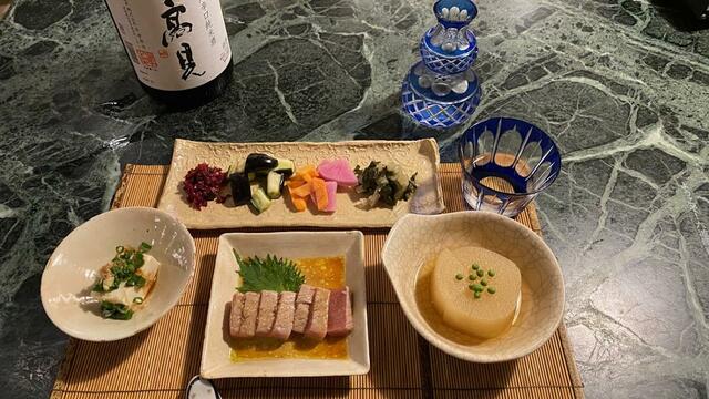 漬物(しば漬け、ナス、にんじん、紫大根、杓子菜)、大根煮、絹豆腐、炙り鮪(ソース:わさびとレモンとオリーブオイルと醤油をMIX)(炙った表面と生マグロの食感と味わいの違いがとても美味)。