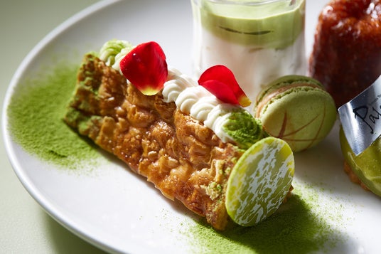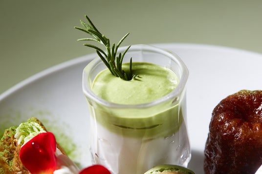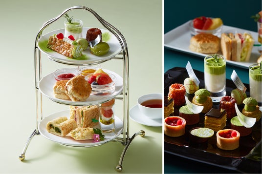 抹茶やピスタチオを使用したスイーツを中心に、見た目と味わいともに爽やかな品々が並ぶアフタヌーンティーは、まるで新緑の風景をそのまま閉じ込めたかのような逸品。