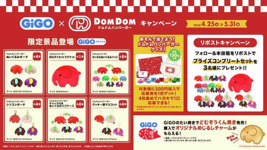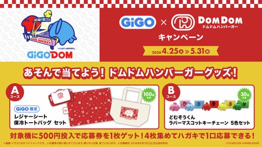 株式会社GENDA GiGO Entertainment(本社:東京都港区 代表取締役社長:二宮 一浩、以下「当社」)は、GiGOグループのお店において、2026年4月25日(土)より、株式会社ドムドムフードサービス(本社:東京都台東区 代表取締役社長:藤崎 忍)が運営する日本初のハンバーガーチェーン『ドムドムハンバーガー』とコラボレーションした、「GiGO×ドムドムハンバーガーキャンペーン」を開催いたします。