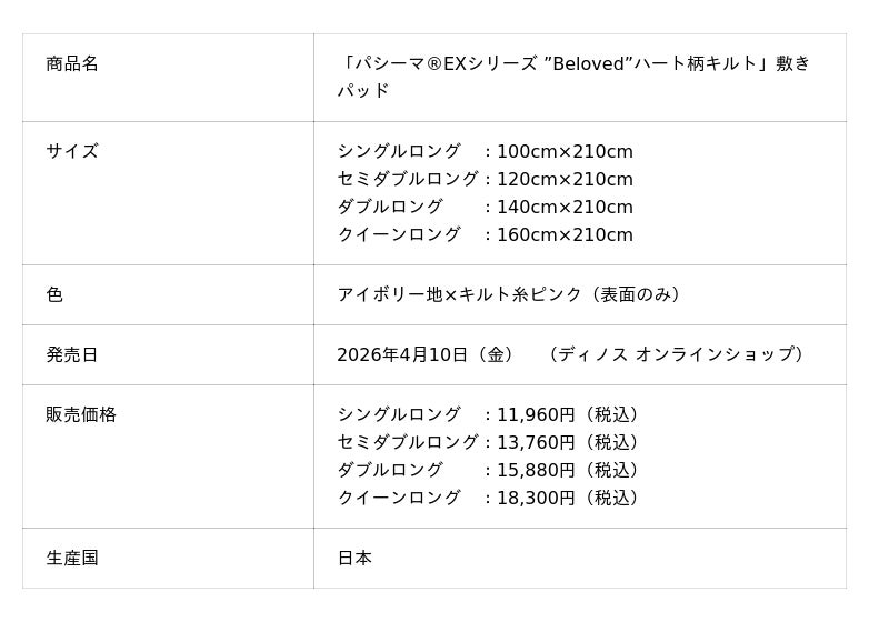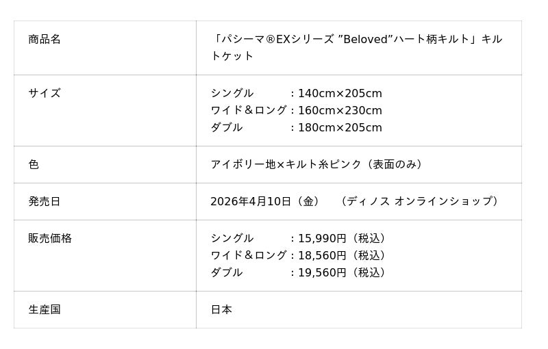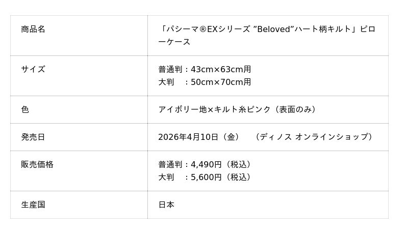 株式会社dinos(本社:東京都中野区、代表取締役社長:加藤 浩輔)は、医療用レベルまで精練した脱脂綿とガーゼを使った肌にやさしい寝具「パシーマ(R)EX」シリーズのdinos限定新商品として、ハート型のキルトが特長の寝具「パシーマ(R)EXシリーズ “Beloved”ハート柄キルト」を企画・開発し、2026年4月10日(金)より『ディノス オンラインショップ』で先行発売します。5月27日(水)には本商品を掲載した当社の基幹カタログ『dinos』2026夏号を発刊し、配布を開始いたします。