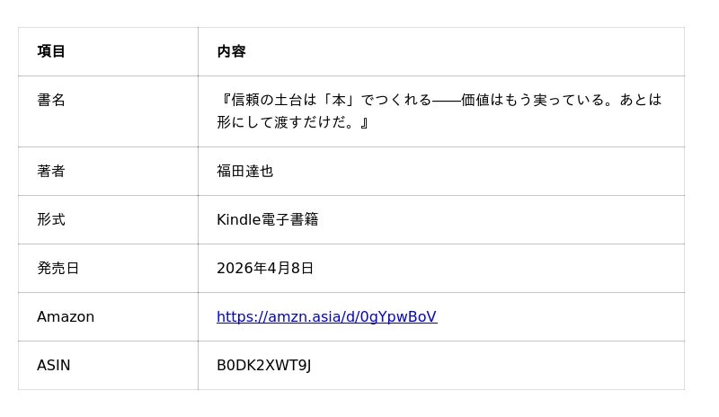 スピード出版ラボ株式会社(代表取締役:福田達也、東京都港区東新橋)は、代表・福田達也の初著書『信頼の土台は「本」でつくれる――価値はもう実っている。あとは形にして渡すだけだ。』が、2026年4月10日(金)にAmazon Kindleストアにおいてランキング総合1位を含む4部門で同時1位を獲得したことをお知らせします。