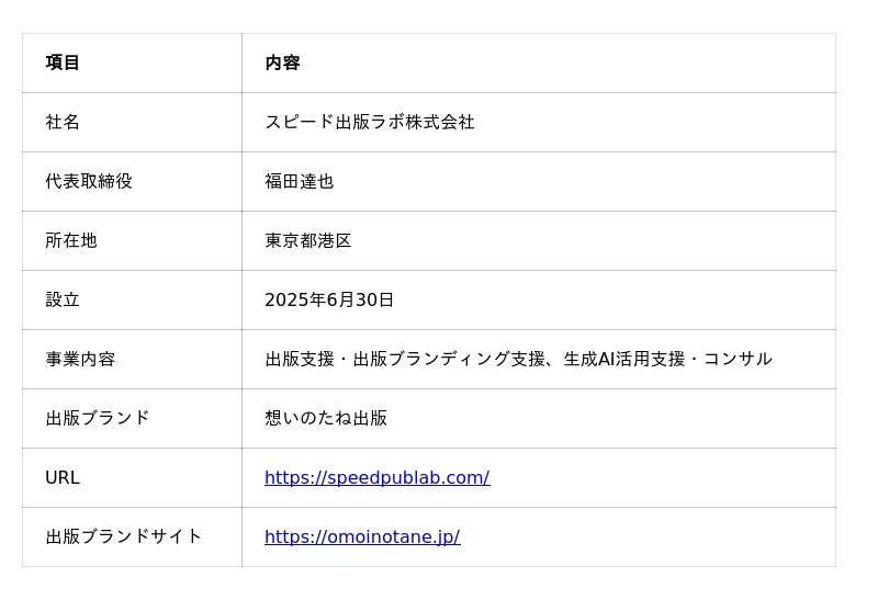 2025年6月、スピード出版ラボ株式会社を設立。出版ブランド「想いのたね出版」を立ち上げ、著者の想いと物語を一冊の本として形にし、必要とする読者へ届けることを使命としている。