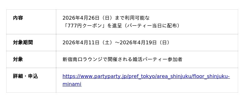 国内最多*¹の成婚数を誇る株式会社IBJ(代表取締役社長:土谷 健次郎、本社:東京都新宿区、東証プライム:6071、以下「IBJ」)が運営する婚活パーティーサービス「IBJ Matching」は、2026年4月、新宿駅東南口より徒歩1分の好立地に位置する「新宿南口ラウンジ」をリニューアルいたしました。本リニューアルでは、多くの婚活参加者が抱える「周囲からの視線が気になる」という心理的ストレスを、独自の“円形カーテン”によって解消。プライバシーが守られた空間で、より深く、誠実な対話を促進します。利便性の高い新宿エリアにおいて、IBJは今後も、一組でも多くの幸せな出会いの創出に向け、快適で質の高いサービスの提供に努めてまいります。