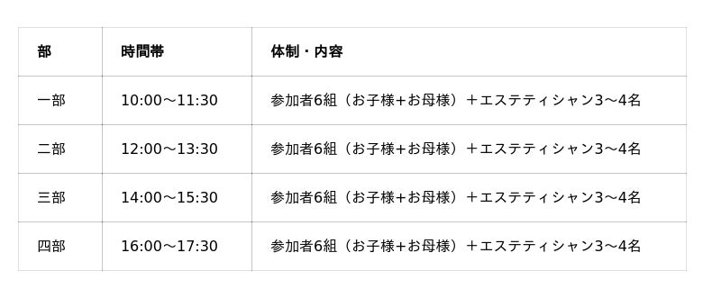 本イベントは、10歳以上のお子さまがプロのエステティシャンの指導のもと、お母様へのフェイシャルケアを体験する感動的な親子参加型プログラムです。「いつもありがとう」という言葉を、自分の手で、肌で伝える。日常ではなかなか届けられない深い感謝を、記憶に残るひとときへと昇華させます。