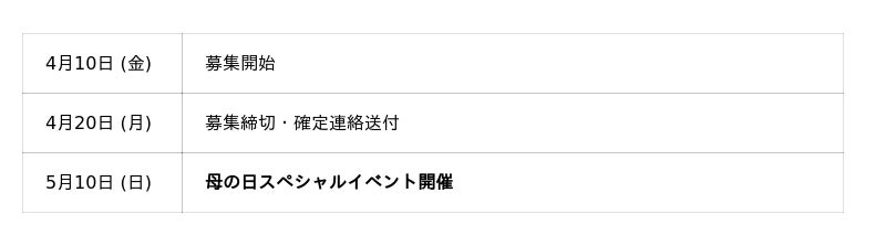 申込フォームよりご応募いただいた方の中から、抽選にて参加者を選考させていただきます。当選結果につきましては、4月20日頃にメールにてご連絡いたします。
