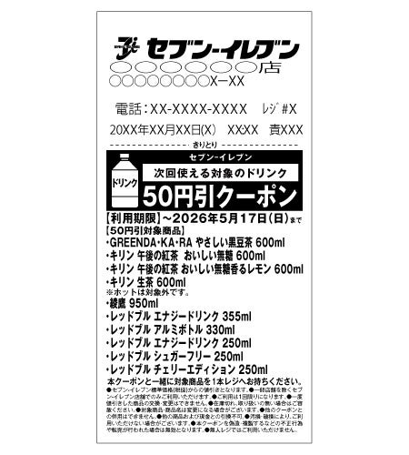 内容:対象のドリンクを1本購入するたびに、次回使える50円引きレシートクーポンが1枚もらえます。